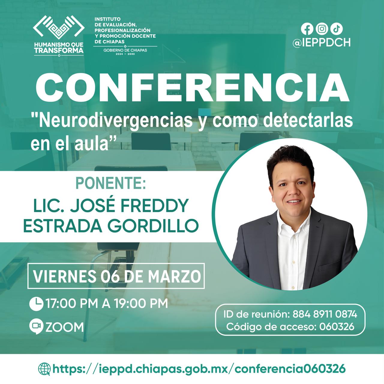 Conferencia: “Neurodivergencias y cómo detectarlas en el aula” BY ieppdch 26 febrero, 2026 🧠✨ ¡No te pierdas nuestra próxima conferencia!El Instituto de Evaluación, Profesionalización y Promoción Docente de Chiapas te invita a la conferencia:“Neurodivergencias y cómo detectarlas en el aula” 👨🏫 Ponente: José Freddy Estrada Gordillo📅 Viernes 06 de marzo⏰ 17:00 a 19:00 horas💻 Modalidad: Zoom🎯 Dirigido a docentes y personal educativo interesados en fortalecer la inclusión y la detección oportuna en el aula.🔗 Acceso directo: https://ieppd.chiapas.gob.mx/conferencia060326Credenciales Zoom:🆔 ID de reunión: 884 8911 0874🔐 Código de acceso: 060326📚 ¡Actualízate, fortalece tu práctica docente y transforma tu aula desde la inclusión!#HumanismoQueTransforma #EducaciónInclusiva #Neurodivergencias #IEPPDCH